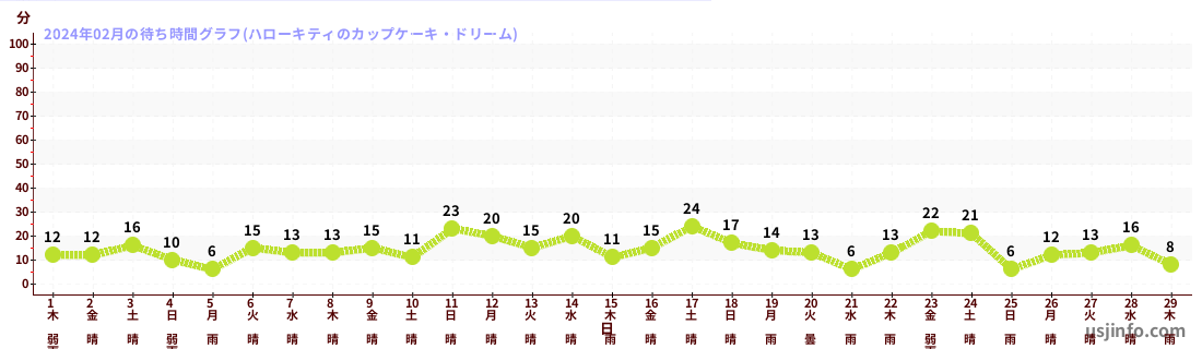 • ハローキティのカップケーキ・ドリーム$B$N(B2024年02月01日のの一日平均待ち時間