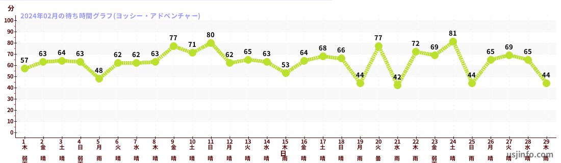 • ヨッシー・アドベンチャー$B$N(B2024年02月01日のの一日平均待ち時間