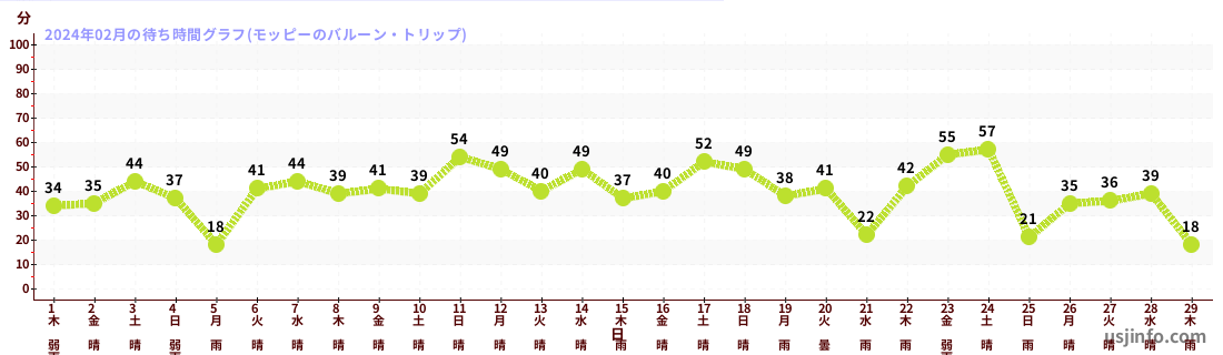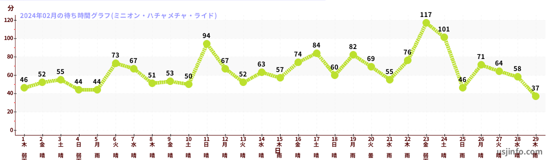 • ミニオン・ハチャメチャ・ライド$B$N(B2024年02月01日のの一日平均待ち時間