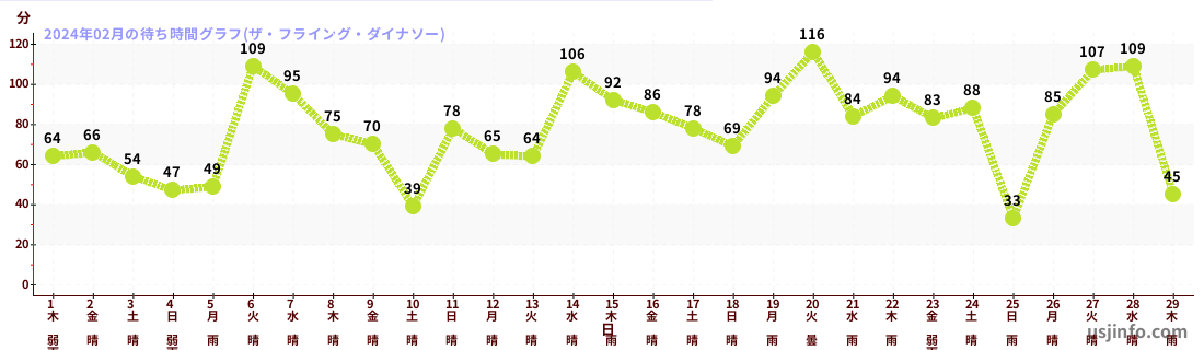 • ザ・フライング・ダイナソー$B$N(B2024年02月01日のの一日平均待ち時間