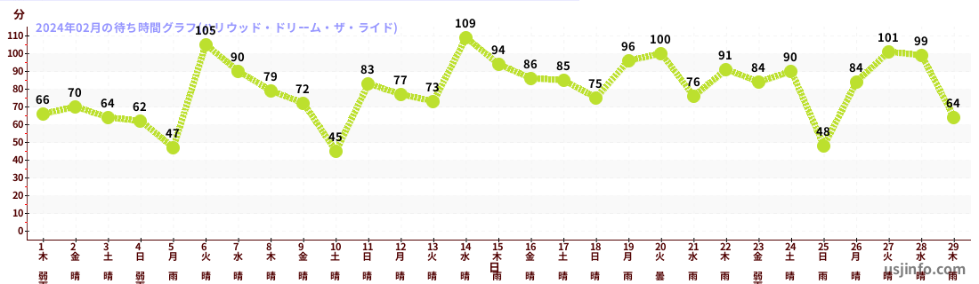 • ハリウッド・ドリーム・ザ・ライド$B$N(B2024年02月01日のの一日平均待ち時間