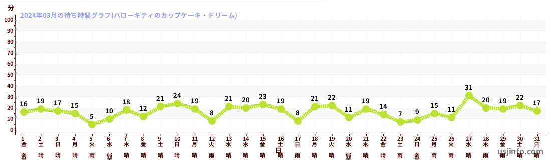 • ハローキティのカップケーキ・ドリーム$B$N(B2024年03月01日のの一日平均待ち時間