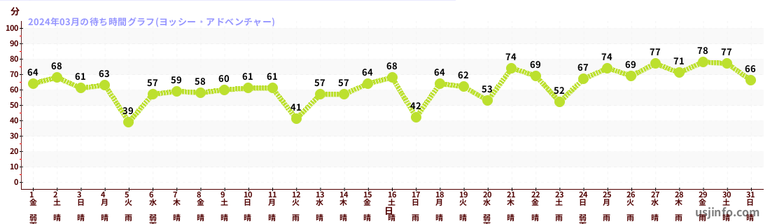• ヨッシー・アドベンチャー$B$N(B2024年03月01日のの一日平均待ち時間