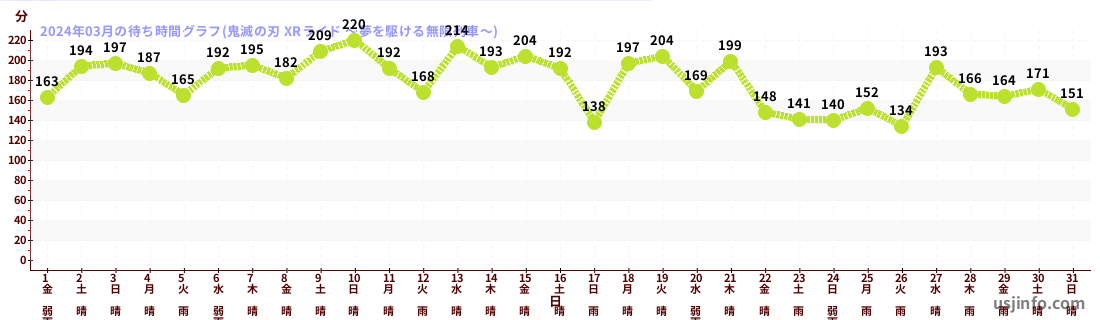 • 鬼滅の刃 XRライド$B$N(B2024年03月01日のの一日平均待ち時間