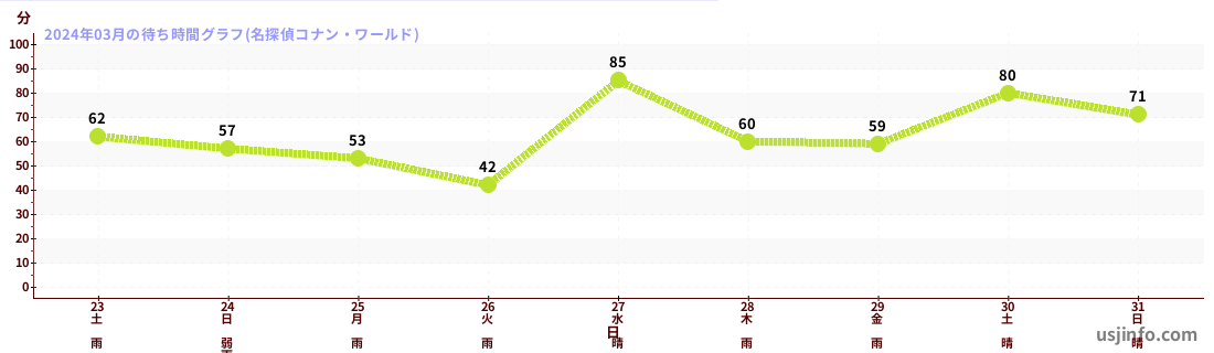 • 名探偵コナン・ワールド$B$N(B2024年03月01日のの一日平均待ち時間