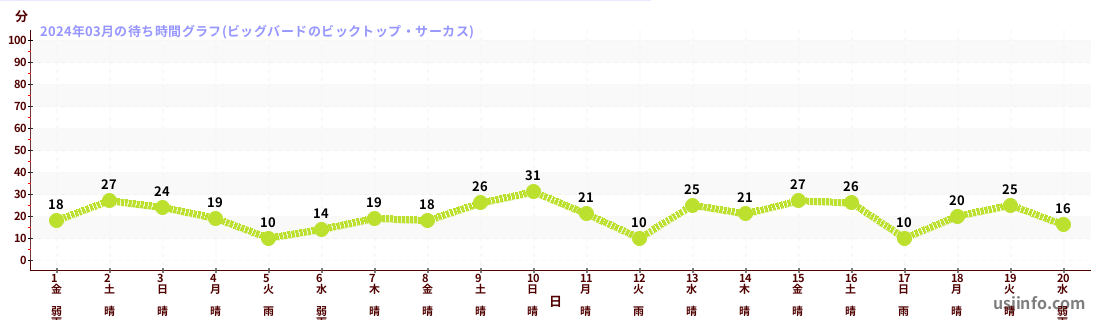 • ビッグバードのビックトップ・サーカス$B$N(B2024年03月01日のの一日平均待ち時間