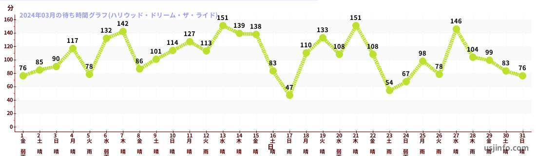 • ハリウッド・ドリーム・ザ・ライド$B$N(B2024年03月01日のの一日平均待ち時間