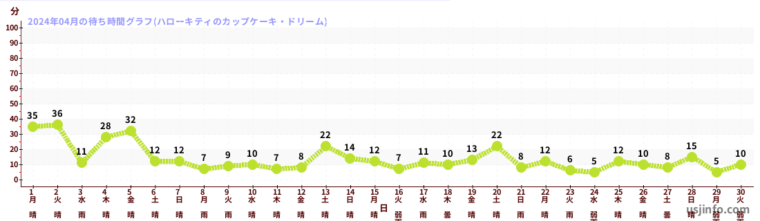 • ハローキティのカップケーキ・ドリーム$B$N(B2024年04月01日のの一日平均待ち時間