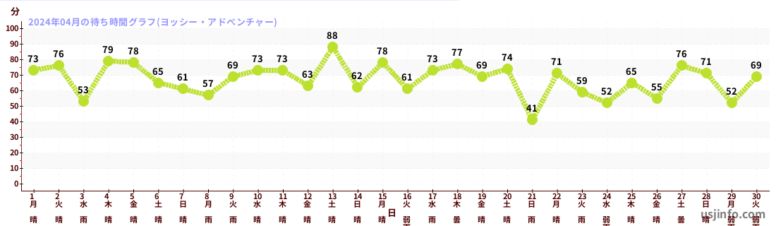• ヨッシー・アドベンチャー$B$N(B2024年04月01日のの一日平均待ち時間