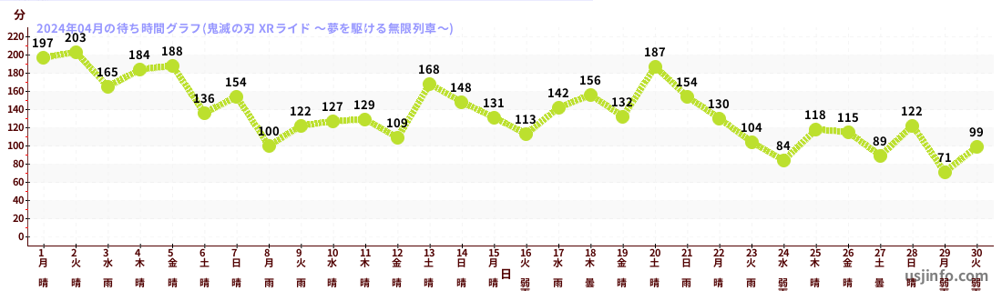 • 鬼滅の刃 XRライド$B$N(B2024年04月01日のの一日平均待ち時間