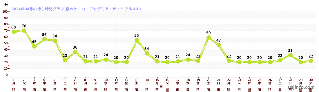 • 僕のヒーローアカデミア・ザ・リアル 4-D$B$N(B2024年04月01日のの一日平均待ち時間