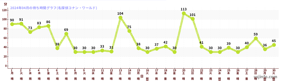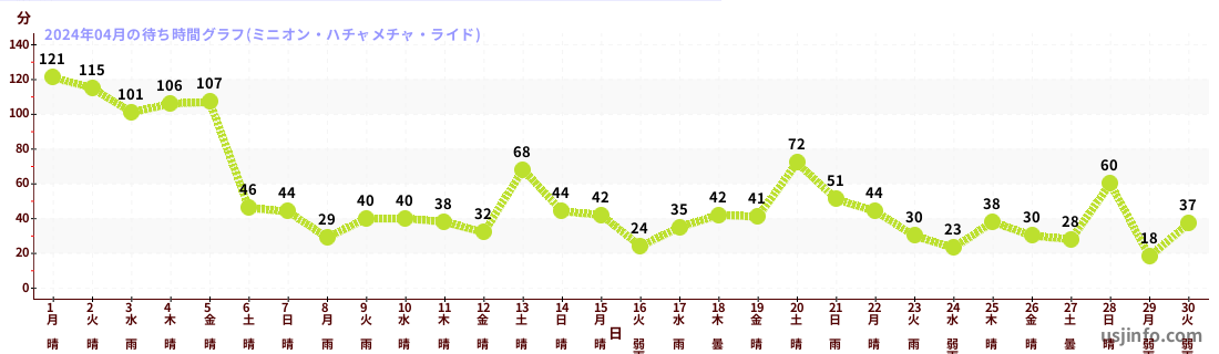 • ミニオン・ハチャメチャ・ライド$B$N(B2024年04月01日のの一日平均待ち時間