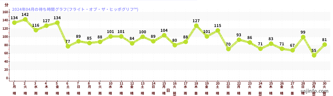 • フライト・オブ・ザ・ヒッポグリフ™$B$N(B2024年04月01日のの一日平均待ち時間