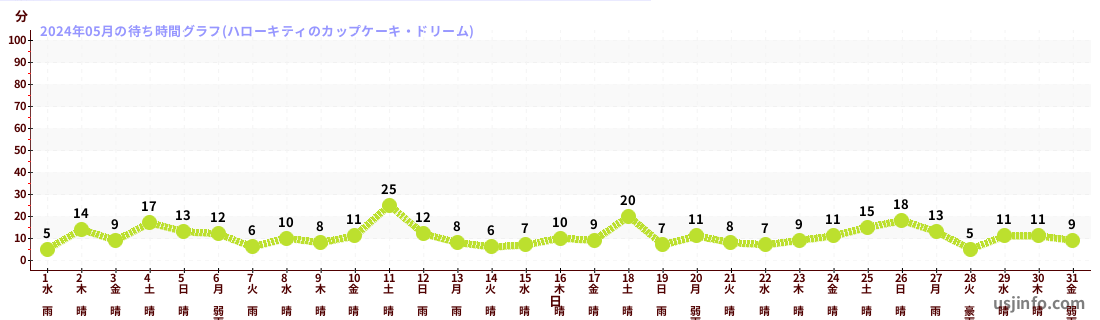 • ハローキティのカップケーキ・ドリーム$B$N(B2024年05月01日のの一日平均待ち時間