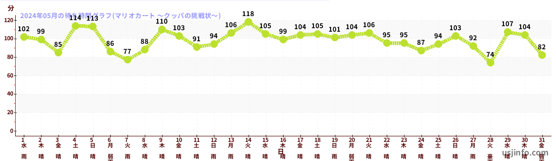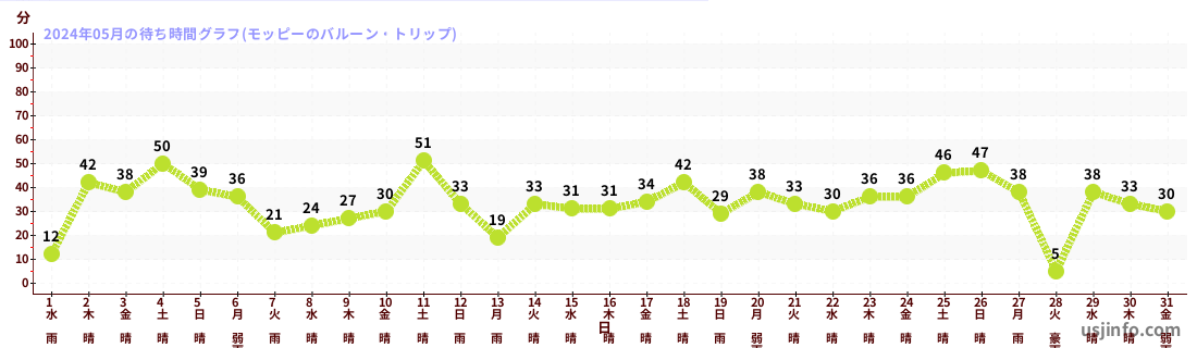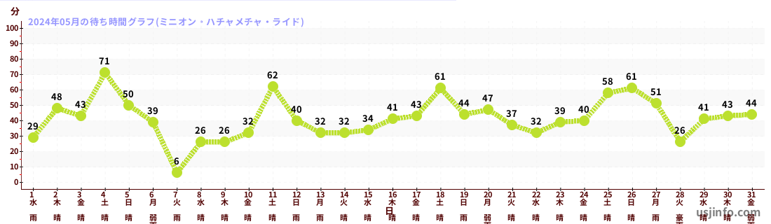 • ミニオン・ハチャメチャ・ライド$B$N(B2024年05月01日のの一日平均待ち時間