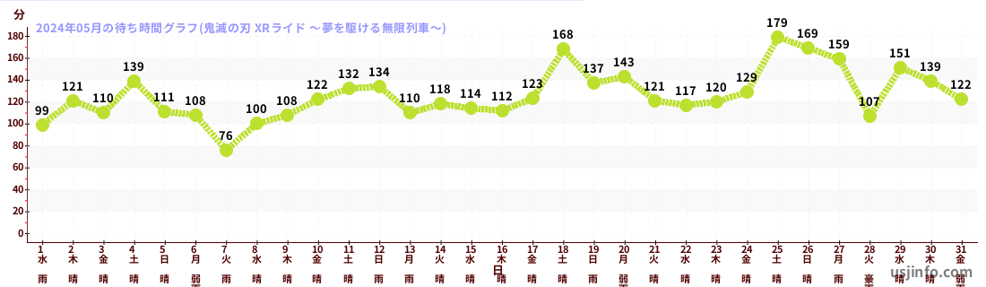 • 鬼滅の刃 XRライド$B$N(B2024年05月01日のの一日平均待ち時間
