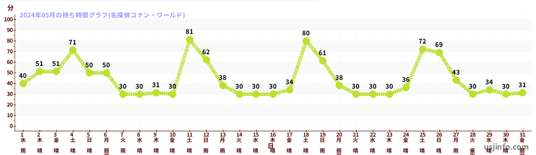 • 名探偵コナン・ワールド$B$N(B2024年05月01日のの一日平均待ち時間