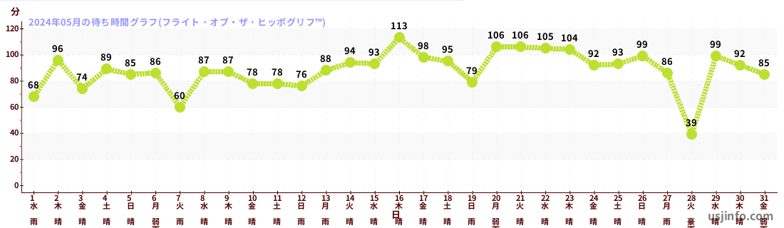 • フライト・オブ・ザ・ヒッポグリフ™$B$N(B2024年05月01日のの一日平均待ち時間