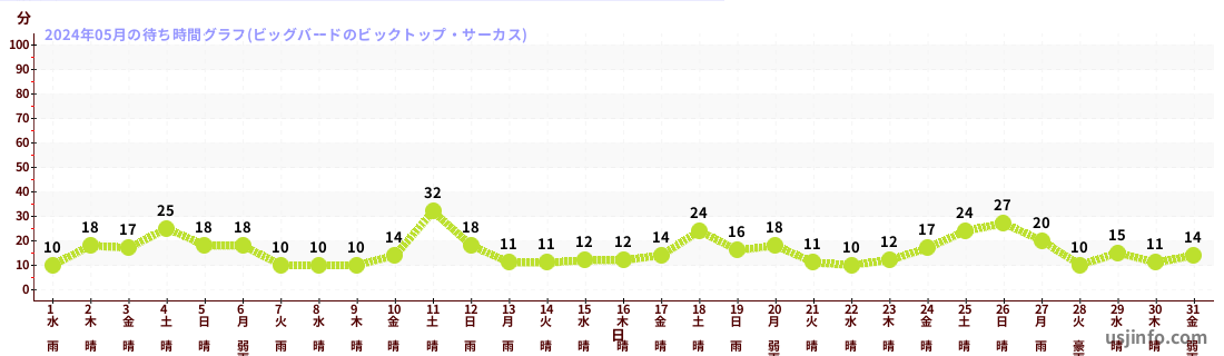 • ビッグバードのビックトップ・サーカス$B$N(B2024年05月01日のの一日平均待ち時間