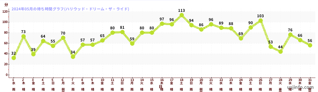 • ハリウッド・ドリーム・ザ・ライド$B$N(B2024年05月01日のの一日平均待ち時間