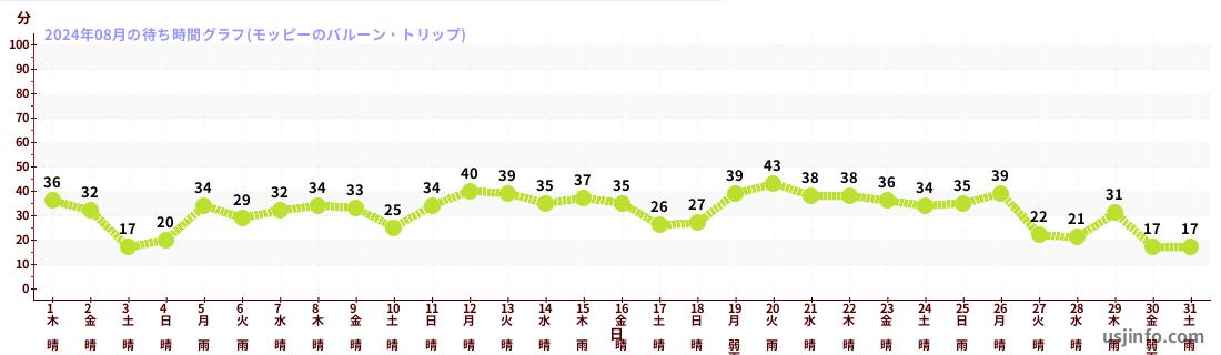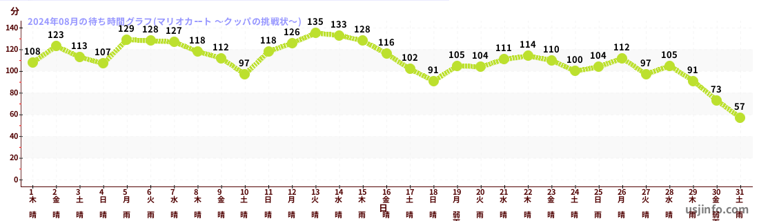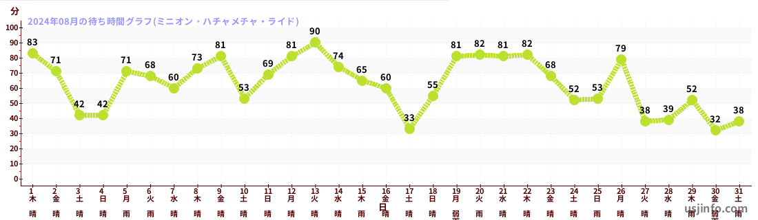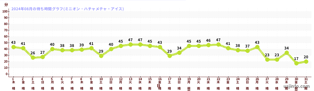 • ミニオン・ハチャメチャ・ライド$B$N(B2024年08月01日のの一日平均待ち時間