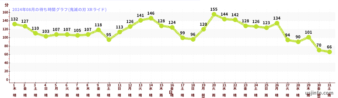 • 鬼滅の刃 XRライド$B$N(B2024年08月01日のの一日平均待ち時間