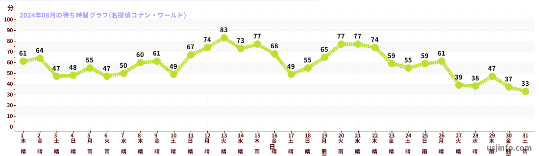 • 名探偵コナン・ワールド$B$N(B2024年08月01日のの一日平均待ち時間
