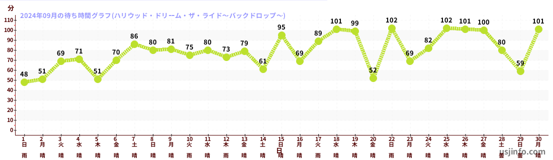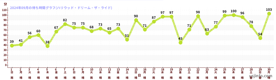 • ハリウッド・ドリーム・ザ・ライド$B$N(B2024年09月01日のの一日平均待ち時間