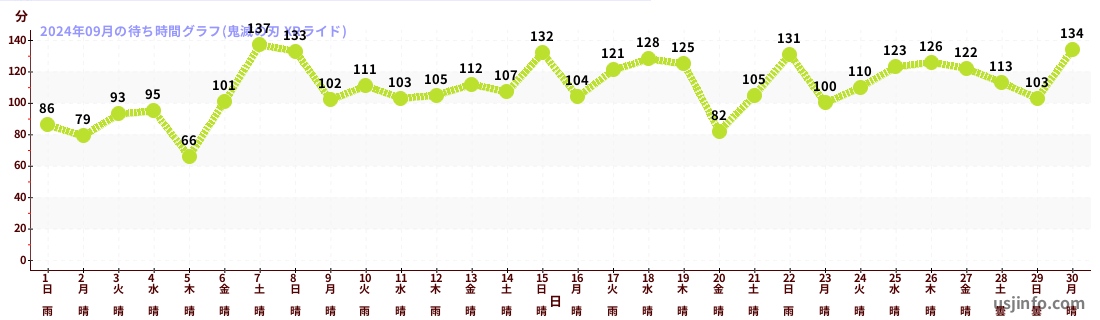 • 鬼滅の刃 XRライド$B$N(B2024年09月01日のの一日平均待ち時間