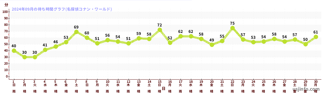 • 名探偵コナン・ワールド$B$N(B2024年09月01日のの一日平均待ち時間