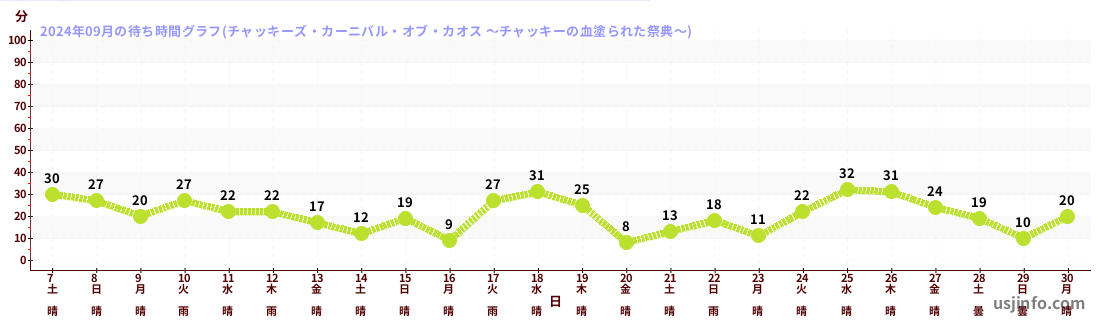 • チャッキーズ・カーニバル・オブ・カオス ~チャッキーの血塗られた祭典~$B$N(B2024年09月01日のの一日平均待ち時間