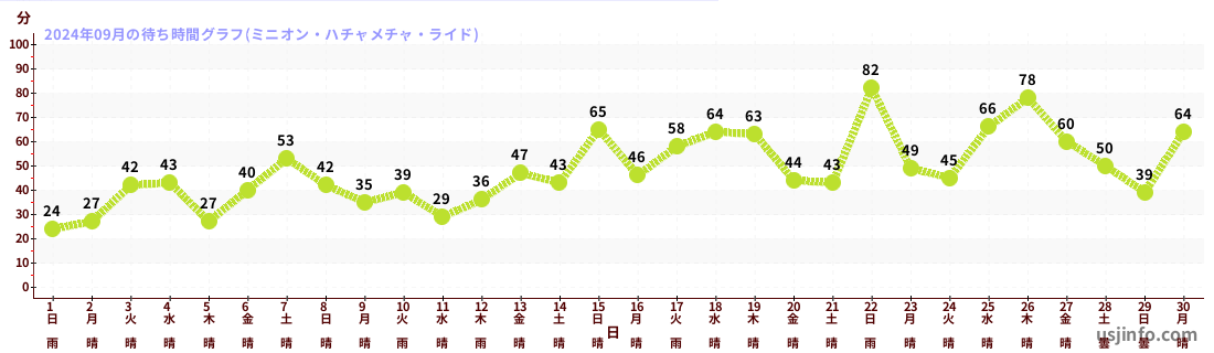 • ミニオン・ハチャメチャ・ライド$B$N(B2024年09月01日のの一日平均待ち時間