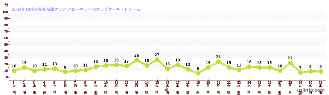 • ハローキティのカップケーキ・ドリーム$B$N(B2024年10月01日のの一日平均待ち時間