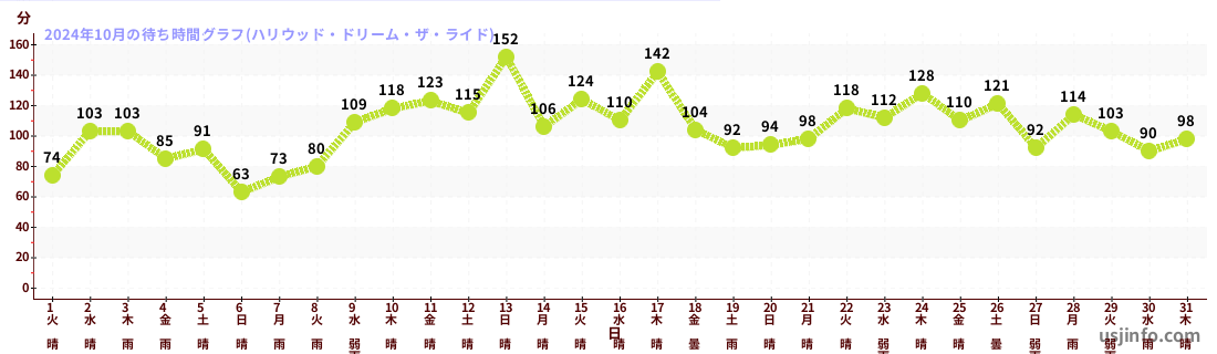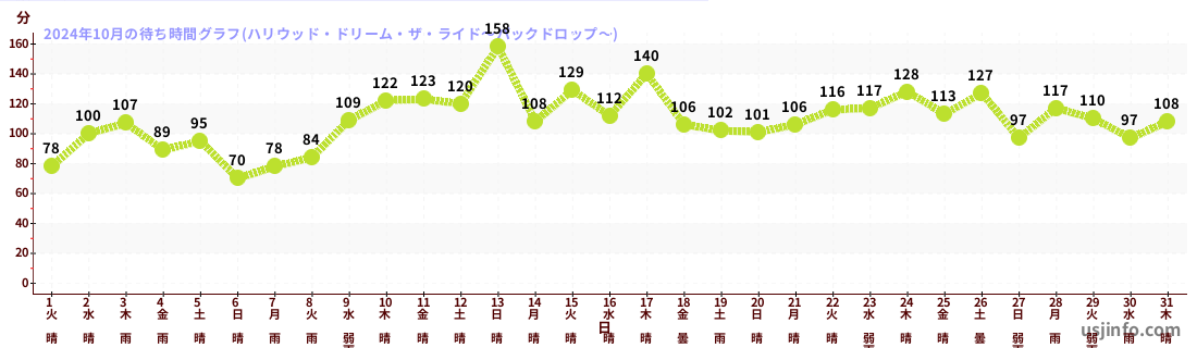 • ハリウッド・ドリーム・ザ・ライド$B$N(B2024年10月01日のの一日平均待ち時間