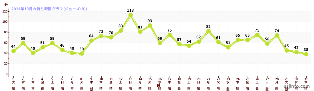 • ジョーズ(R)$B$N(B2024年10月01日のの一日平均待ち時間
