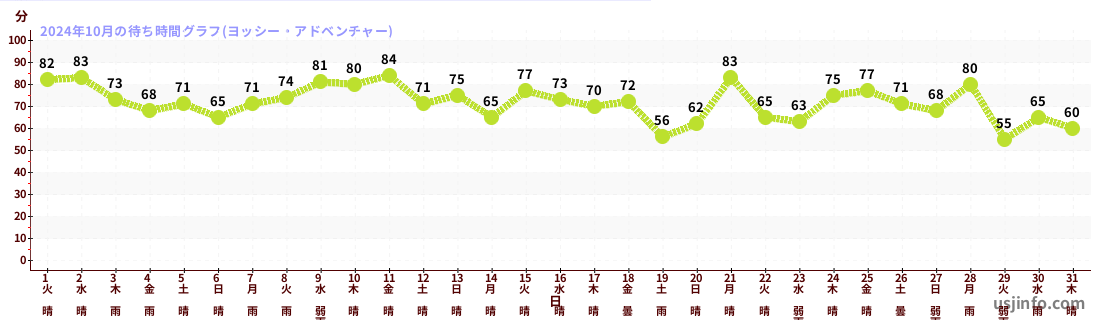 • ヨッシー・アドベンチャー$B$N(B2024年10月01日のの一日平均待ち時間