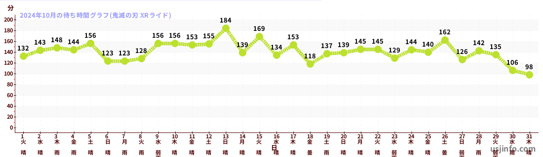 • 鬼滅の刃 XRライド$B$N(B2024年10月01日のの一日平均待ち時間