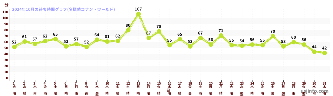 • 名探偵コナン・ワールド$B$N(B2024年10月01日のの一日平均待ち時間