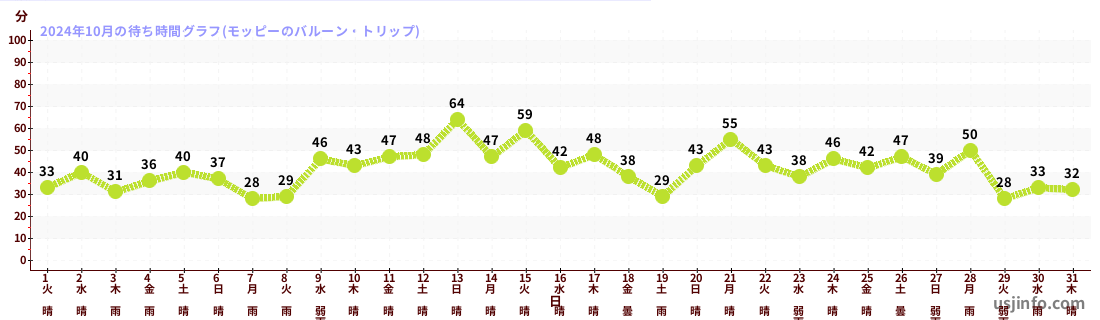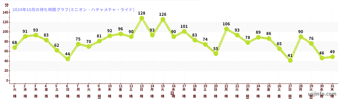 • ミニオン・ハチャメチャ・ライド$B$N(B2024年10月01日のの一日平均待ち時間