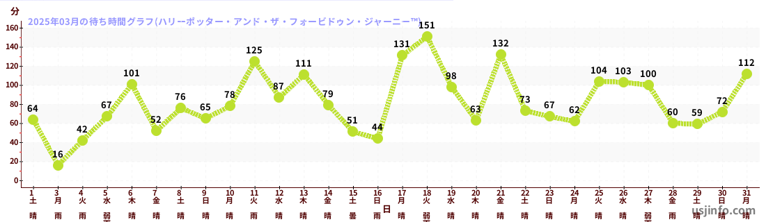 • ハリーポッター・アンド・ザ・フォービドゥン・ジャーニー™$B$N(B2025年03月01日のの一日平均待ち時間