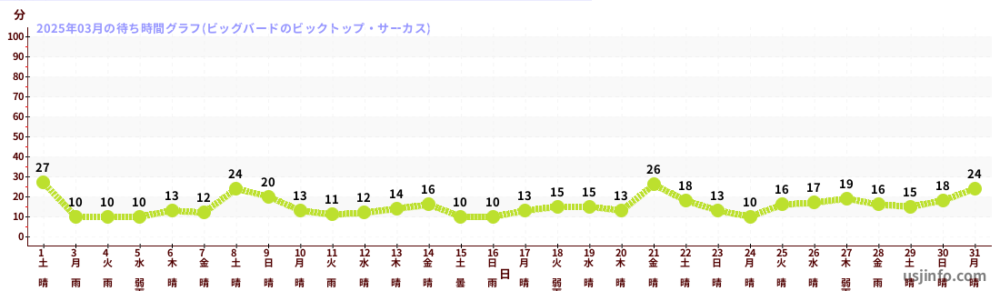 • ビッグバードのビックトップ・サーカス$B$N(B2025年03月01日のの一日平均待ち時間