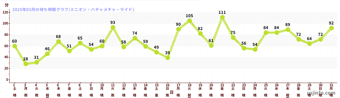 • ミニオン・ハチャメチャ・ライド$B$N(B2025年03月01日のの一日平均待ち時間