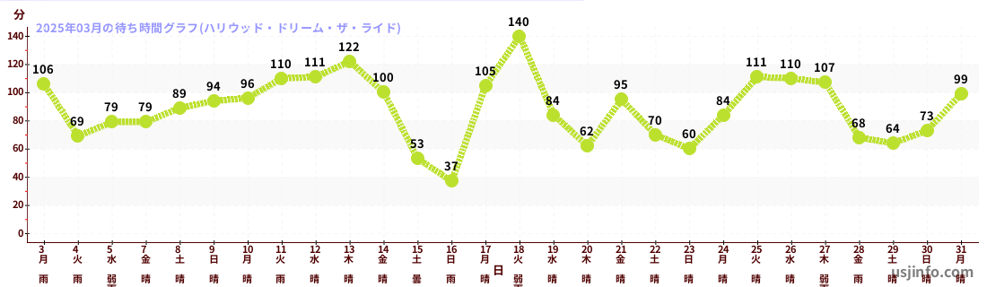 • ハリウッド・ドリーム・ザ・ライド$B$N(B2025年03月01日のの一日平均待ち時間