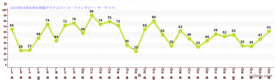 • スペース・ファンタジー・ザ・ライド$B$N(B2025年03月01日のの一日平均待ち時間