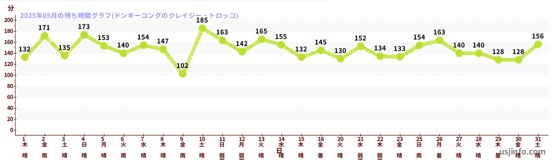 • ドンキーコングのクレイジー・トロッコ$B$N(B2025年05月01日のの一日平均待ち時間
