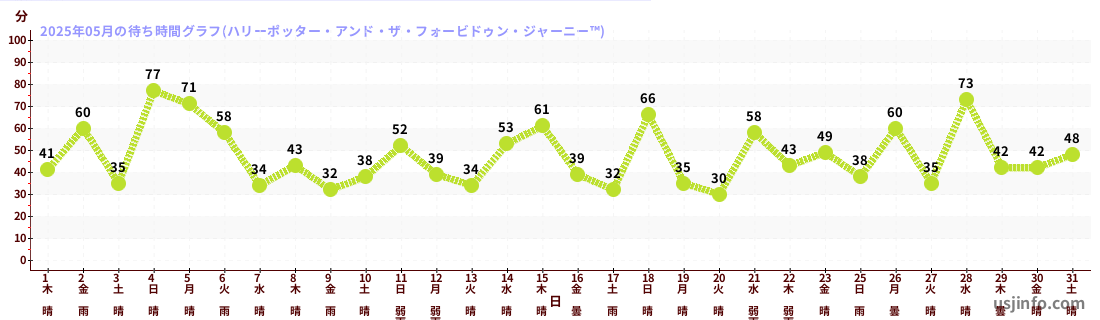 • ハリーポッター・アンド・ザ・フォービドゥン・ジャーニー™$B$N(B2025年05月01日のの一日平均待ち時間