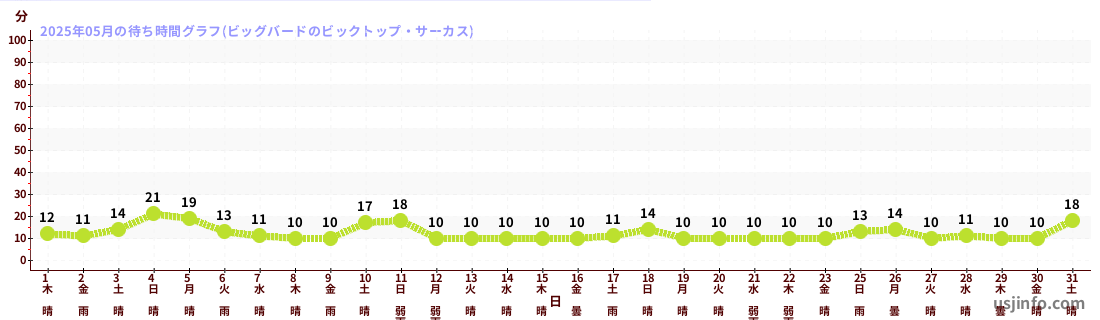 • ビッグバードのビックトップ・サーカス$B$N(B2025年05月01日のの一日平均待ち時間