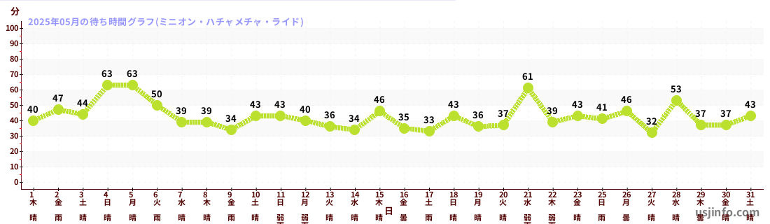 • ミニオン・ハチャメチャ・ライド$B$N(B2025年05月01日のの一日平均待ち時間