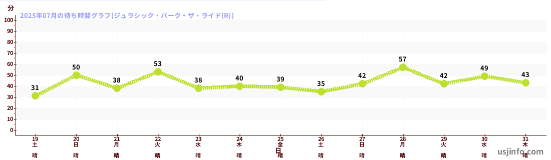 • ジュラシック・パーク・ザ・ライド(R)$B$N(B2025年07月01日のの一日平均待ち時間