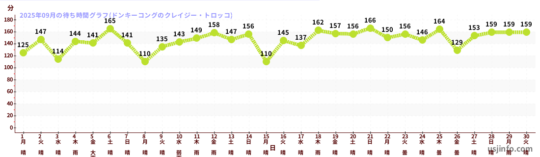• ドンキーコングのクレイジー・トロッコ$B$N(B2025年09月01日のの一日平均待ち時間